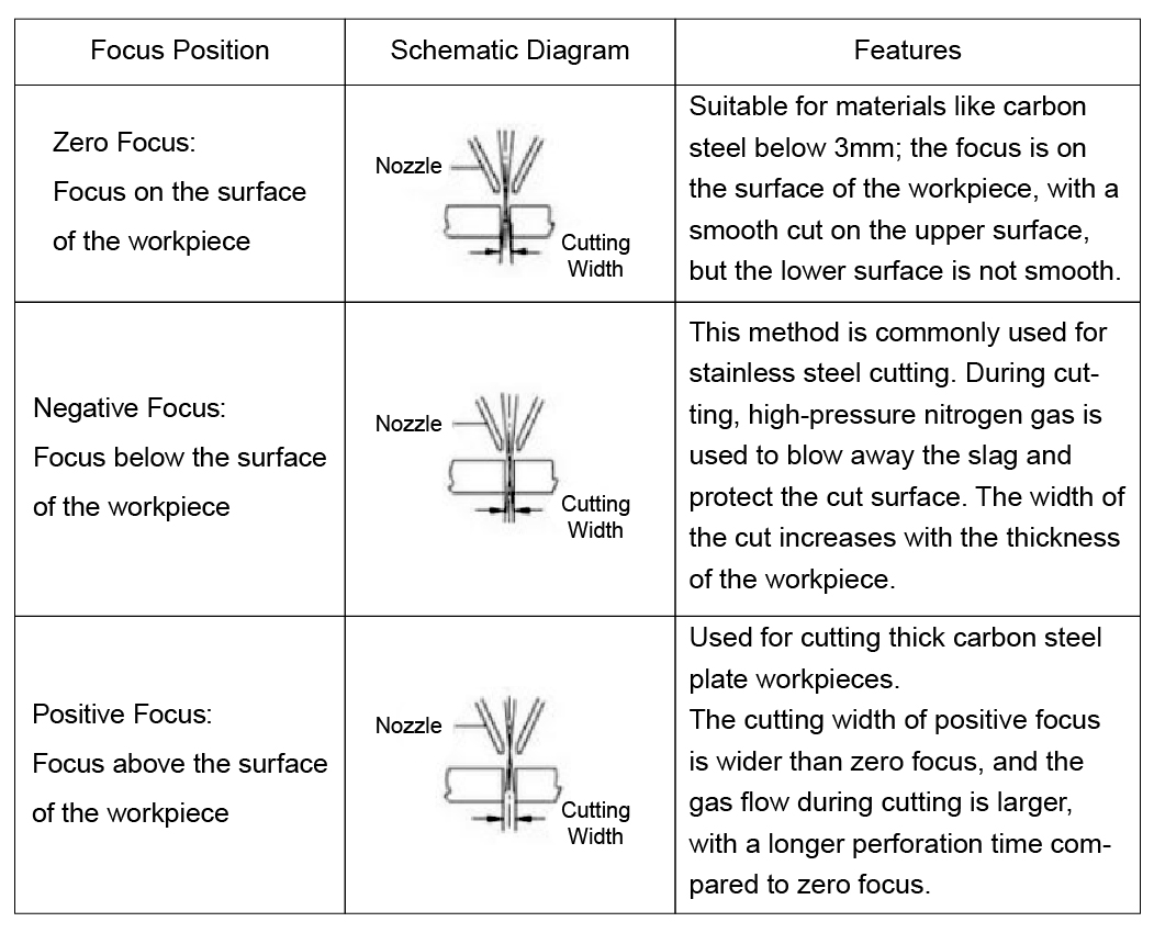 သင့်လျော်သောအာရုံစိုက်သည့်အနေအထားကိုရွေးချယ်ခြင်းအားဖြင့်လေဆာဖြတ်တောက်ခြင်းနှင့်အရည်အသွေးကွဲပြားခြားနားသောသတ္တုပစ္စည်းများအတွက်သိသိသာသာတိုးတက်နိုင်သည်။ အပြုသဘောဆောင်သောအာရုံစိုက်ခြင်း, အပျက်သဘောဆောင်သောအာရုံစိုက်ခြင်းသို့မဟုတ်သုညအာရုံစူးစိုက်မှုသည်အဓိကအားဖြင့်အထူ, လက်တွေ့တွင်မှန်ကန်သောအာရုံစိုက်သည့်အနေအထားသည်ချောမွေ့သောဖြတ်တောက်ခြင်း,